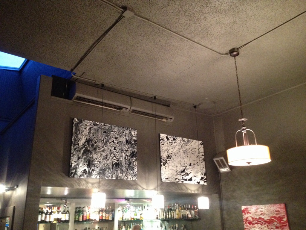 The two Colorstretch paintings I have been working on are finally hanging at Agrodolce Restaurant! They look great, the color scheme I wanted to create is a great combination for where they hang in the restaurant. They are directly over the bar, along with a red Colorstretch that has been there for a while. White on Black #1 & Black on White # 2. They are the largest I have ever created. Lots of time, paint, and hard work went in to making these.