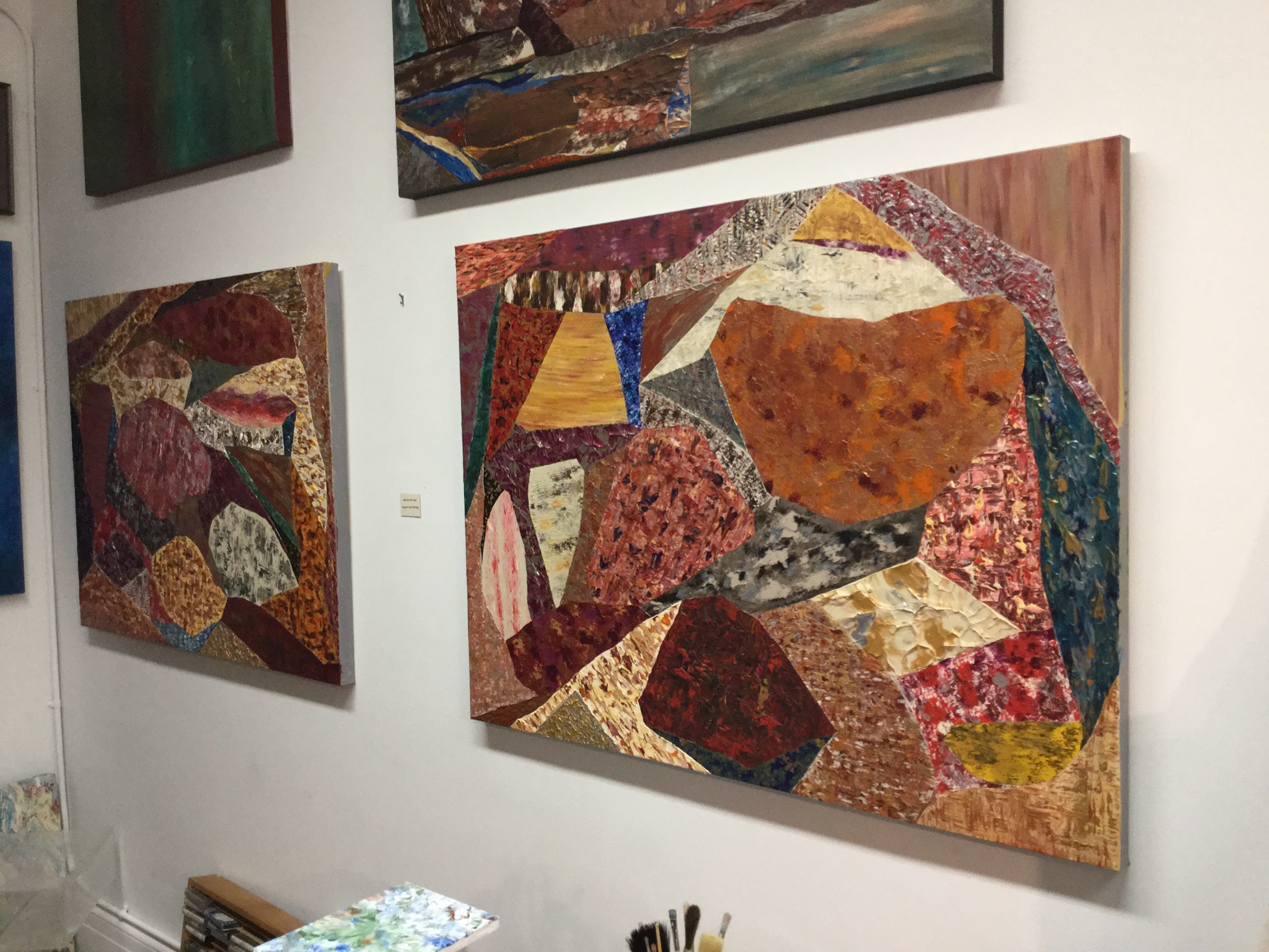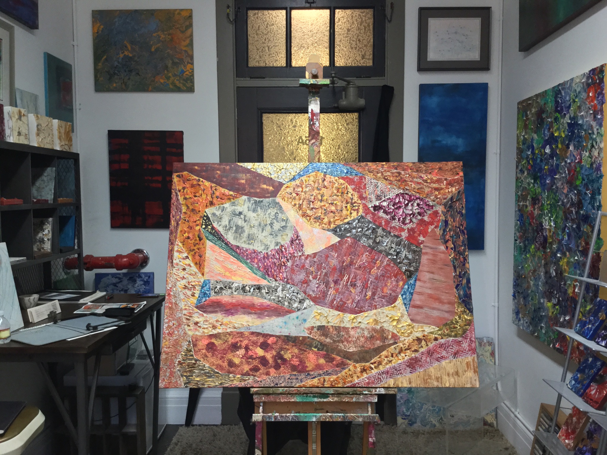 I have completed two of the three paintings that I am doing for Golden Beetle Restaurant in Ballard. The colors chosen were reminiscent of the theme of the restaurant which is Middle Eastern. The two that I completed are on the redder, yellowish, metallic side whereas the middle one will focus on blue and greens which will pull out the blues and metallics in mosaic covered wood fired oven in the kitchen. The oven is very beautiful. I will include pictures of that in a post next week. There are 77 sections between the two, 26 days painting over 60+ hours. I have one more month to finish all three. I will also be making business cards using images of each painting…