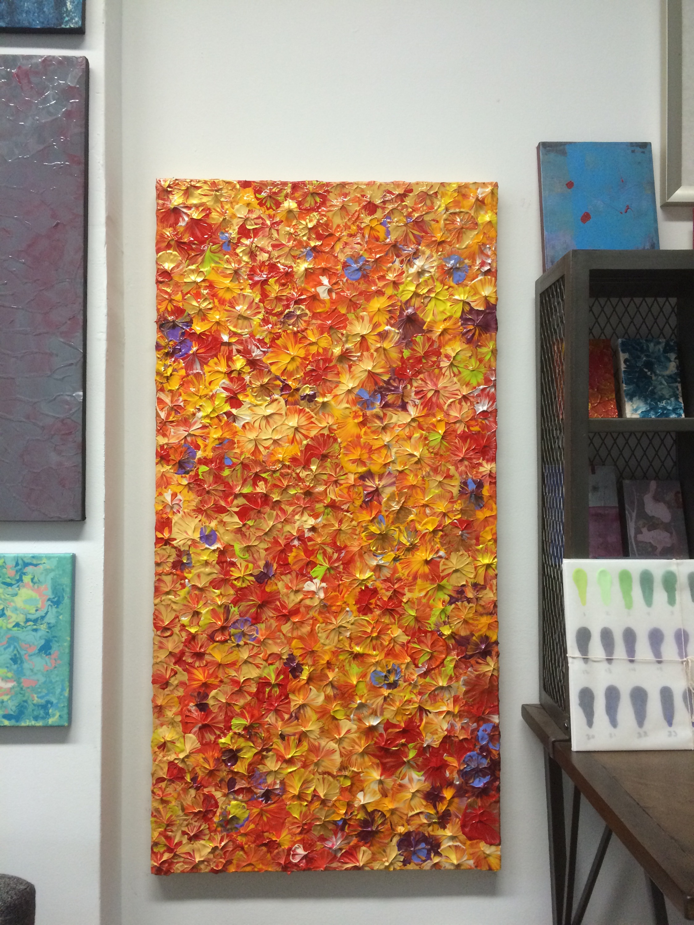 I’ve been commissioned to create an efflorescence painting, and the dimensions are 24″ x 48 “. I created a palate board for them to choose their colors for the piece. They chose over 30 colors, primarily focusing on yellows, oranges and reds, with other colors sprinkled in. The end result was perfect. Peaks and all! Very warm and bright.