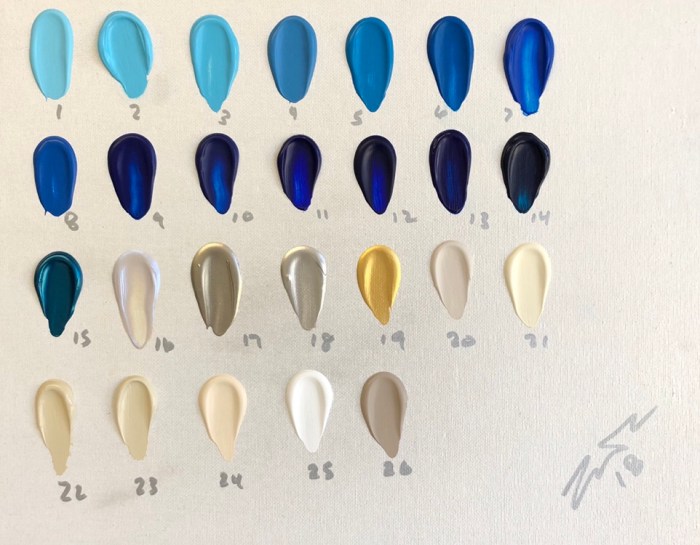 Really excited about my latest commission. It’s for a 48″ x 60″ size canvas, using blues to create a cloud like feel through the chosen color palette. It’s the 5th painting I have made using that size canvas. Picture to follow! Here is the color board for the project 💙