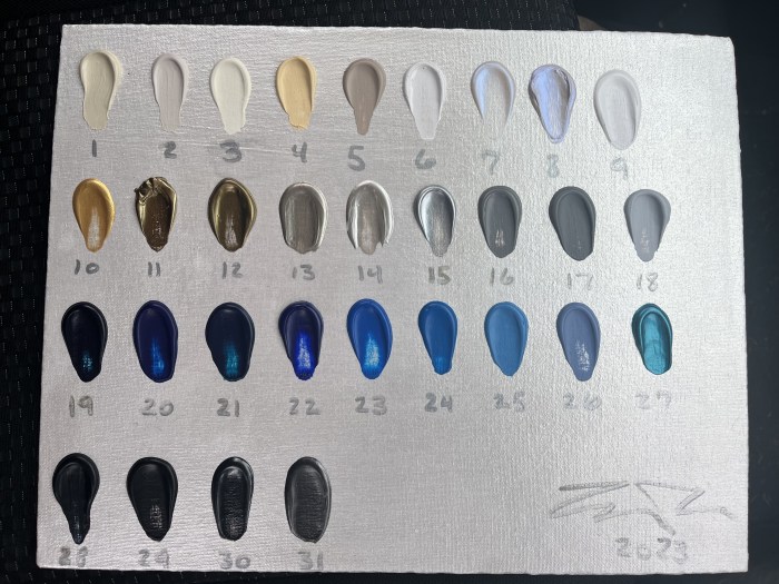 I was approached by a woman who has had my business card for 10 years!!!. She said she has always wanted a flower painting like I make. I am pretty honored that she still remembers me after so long. We met at her home and talked about the painting and I brought her a color board. She was initially thinking blue and a pale flower somehow together. But we eliminated the blues and stuck with just one on the third row of the board. So it will be a Pale Flowers now Focusing on light colors, grays, metallics, and a touch of grey blue………………… more to come!!!