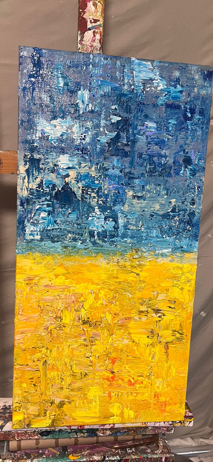 I’m really liking my newest creation! It took a cardboard tube, plastic wrap, and brushes to make it. I’m not sure of the title yet. But for sure it can be hung any way, horizontal or vertical. Being hung vertical, I see fields and sky, or 180°, I see sky and water. I think this piece is one of my favorites. More to come!