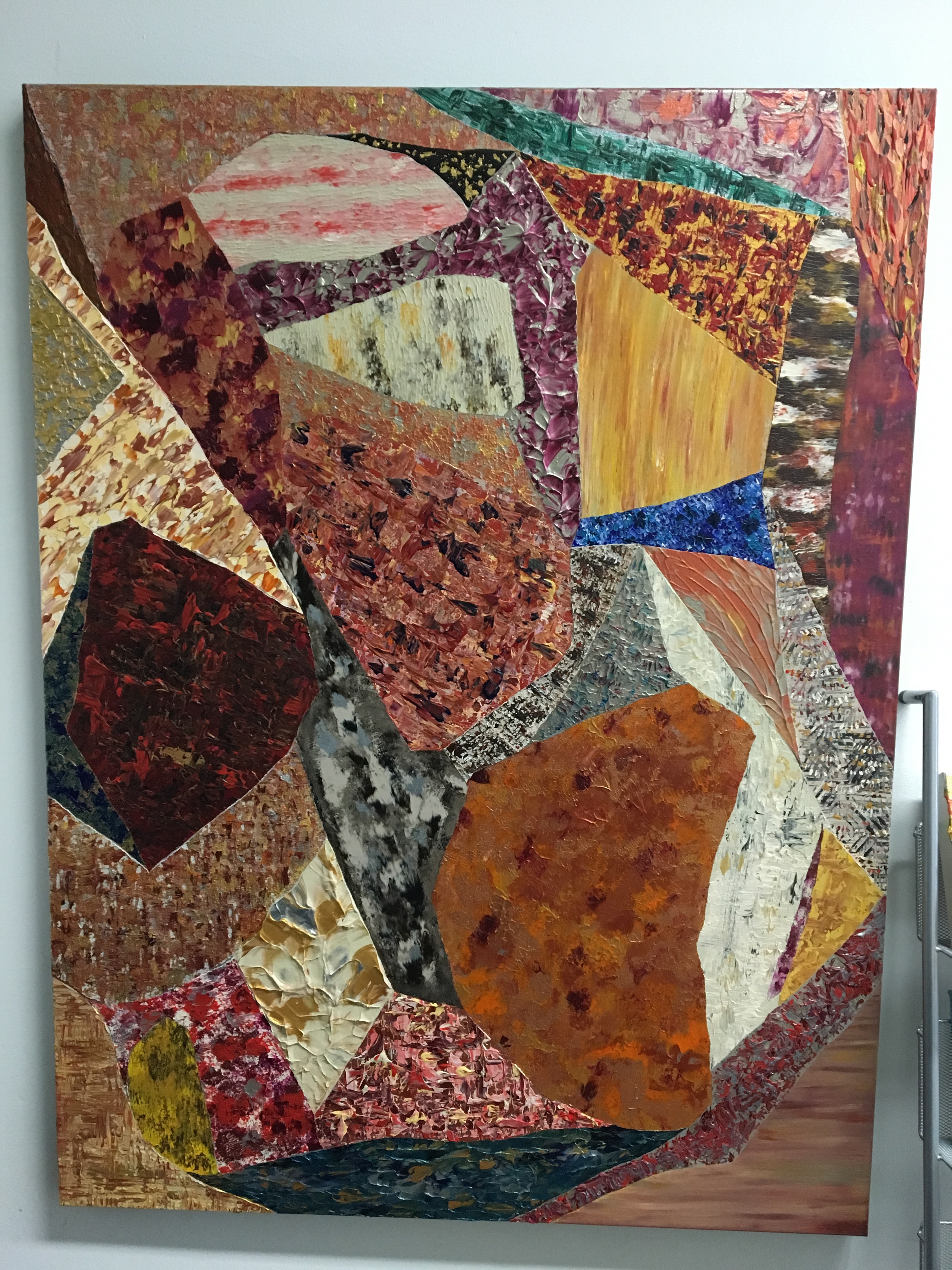 We picked them up from Golden Beetle Saturday, and they sure need a cleaning!!! The name of them “Textured Tryptic”, was a huge undertaking that I did for my friend. But it got me to create something fantastic! Three, 36″ x 48″, for a total of 36 sq ft. There are over 120 separate sections that make up the three. They will be featured for the first time outside of Golden Beetle at my open house the 1st Sunday in December. Pictures to come in a couple of days!
