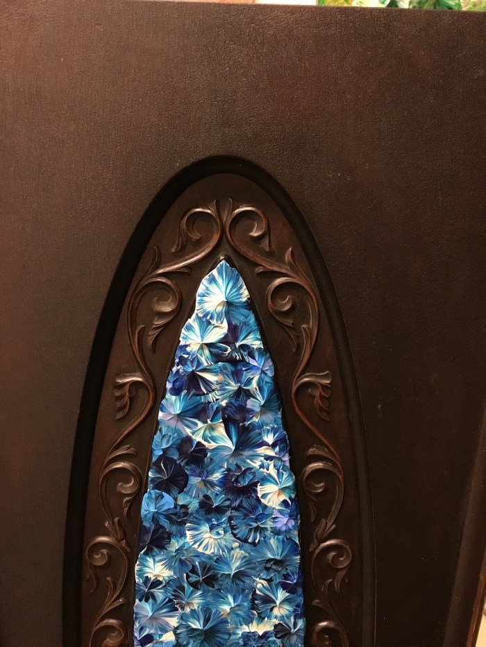 My proposal was to cover a piano in flowers. I didn’t know what my piano was going to look like at all. When they delivered all the pianos, and we were able to choose ours, what caught my eye was a very large upright piano. It had a beautiful oval wood carving on the front of it and I immediately knew I would paint flowers on that particular spot, because the flowers painted there would be showcased perfectly. It turned out to be made in Chicago, which is one of my favorite cities, but also that it was an upright grand piano, never knew they made a grand piano that way. I ended up leaving parts of the piano unpainted and those I painted black. It looks really neat and unique.