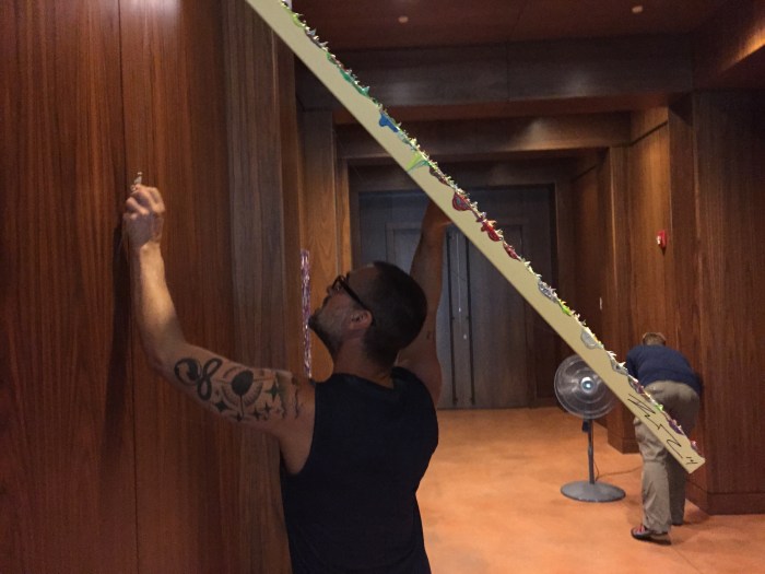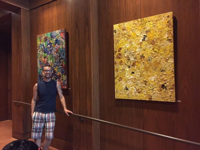 The install went perfect. The paintings are suspended from wires which made it the easiest hang ever! A big thank you to my Mom, Matt, and Kari for helping!!! Now I have a whole wall empty in my studio. Which is great, so I can start making more art. Three new flower paintings will be painted before month’s end!