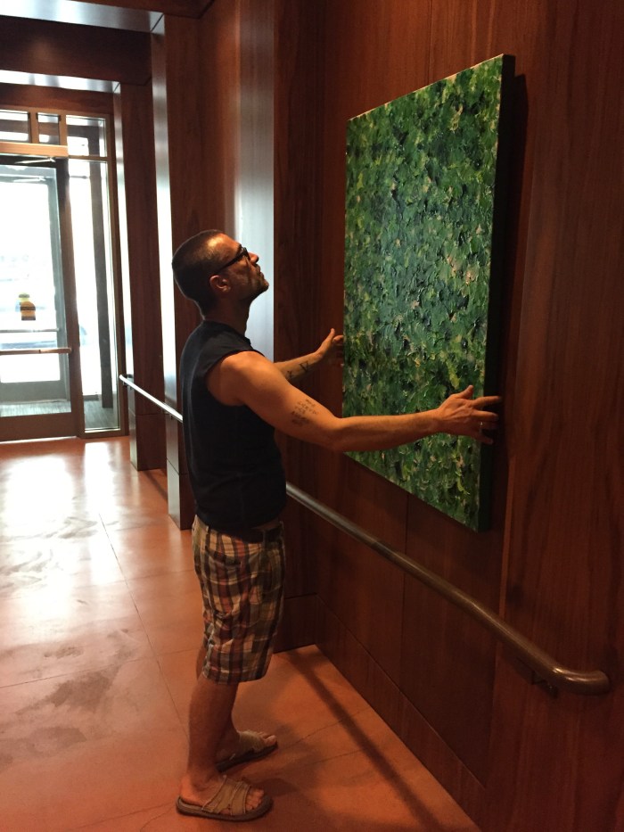 The commission being so large, 48″ x 60″, was painted and sprayed at my second studio. The sides were painted at Inscspe along with installing the hardware. Here is me renting a van, moving it from one studio to the next. It’s a big piece, only four so far, that size… I will formally add it to my Efflorescence gallery this week!