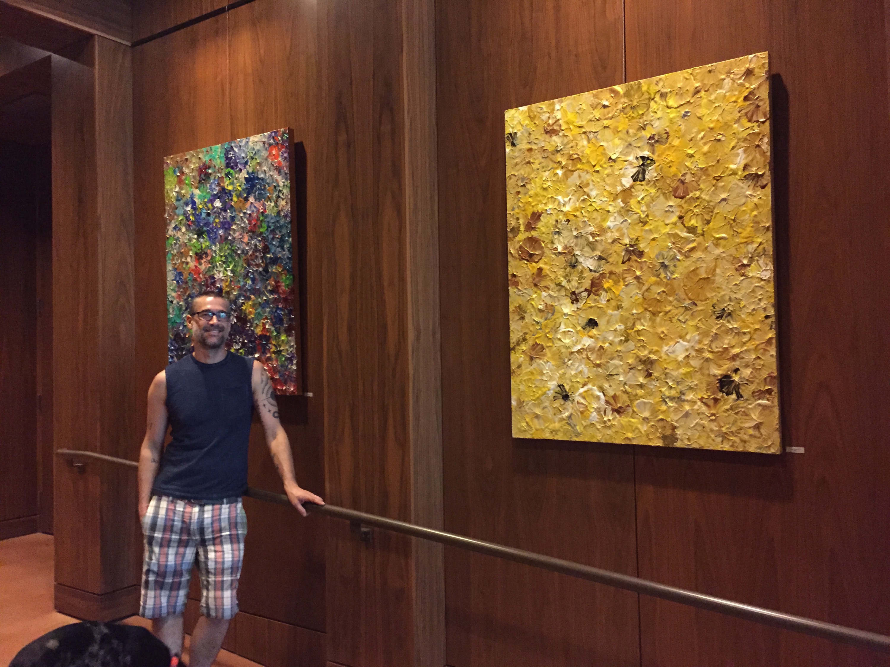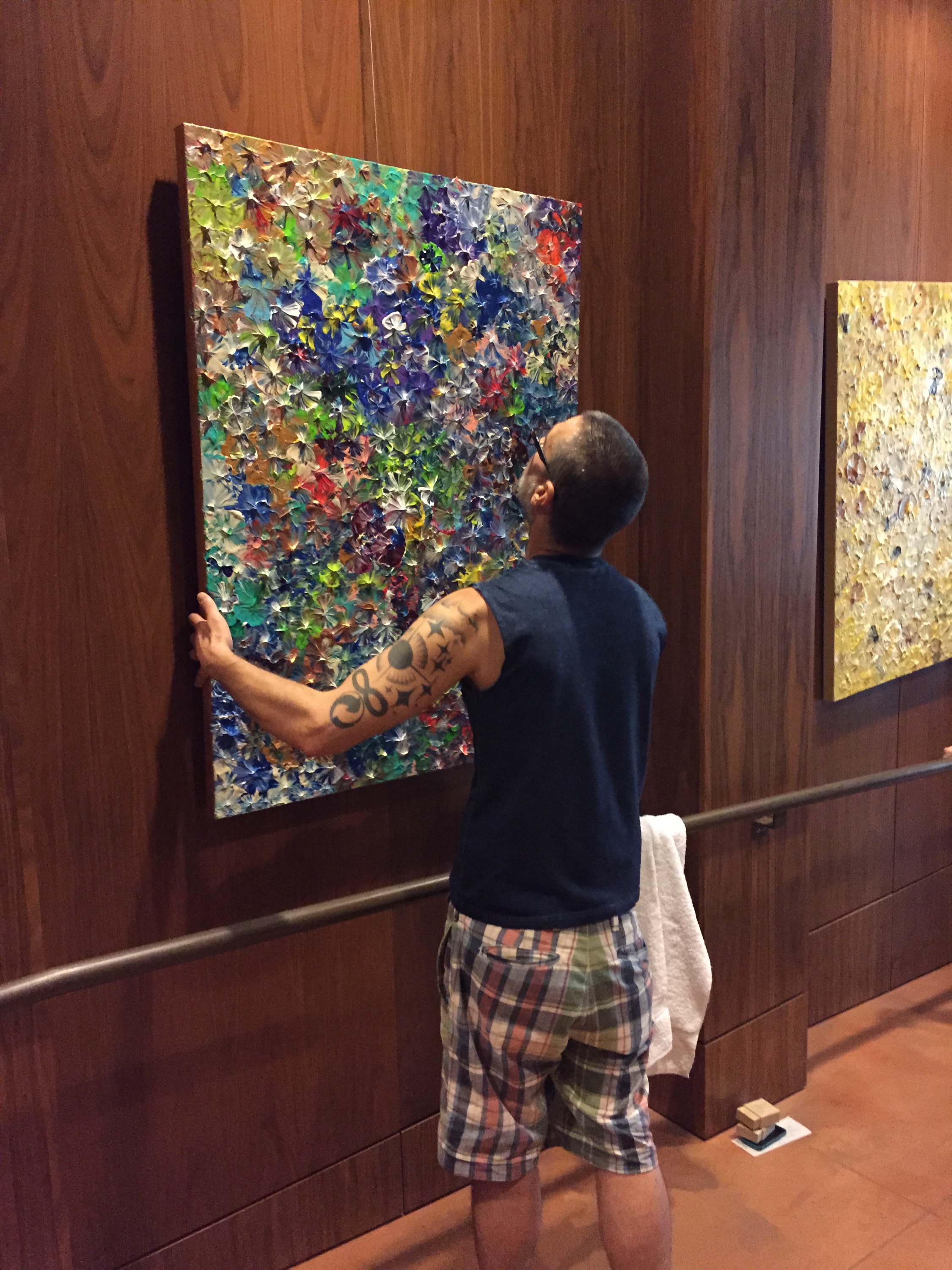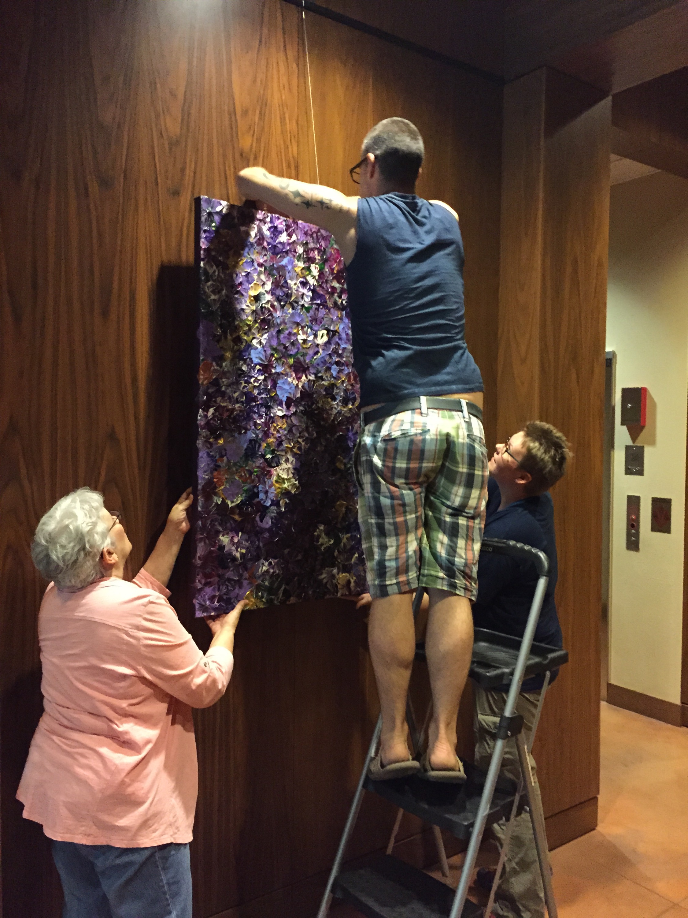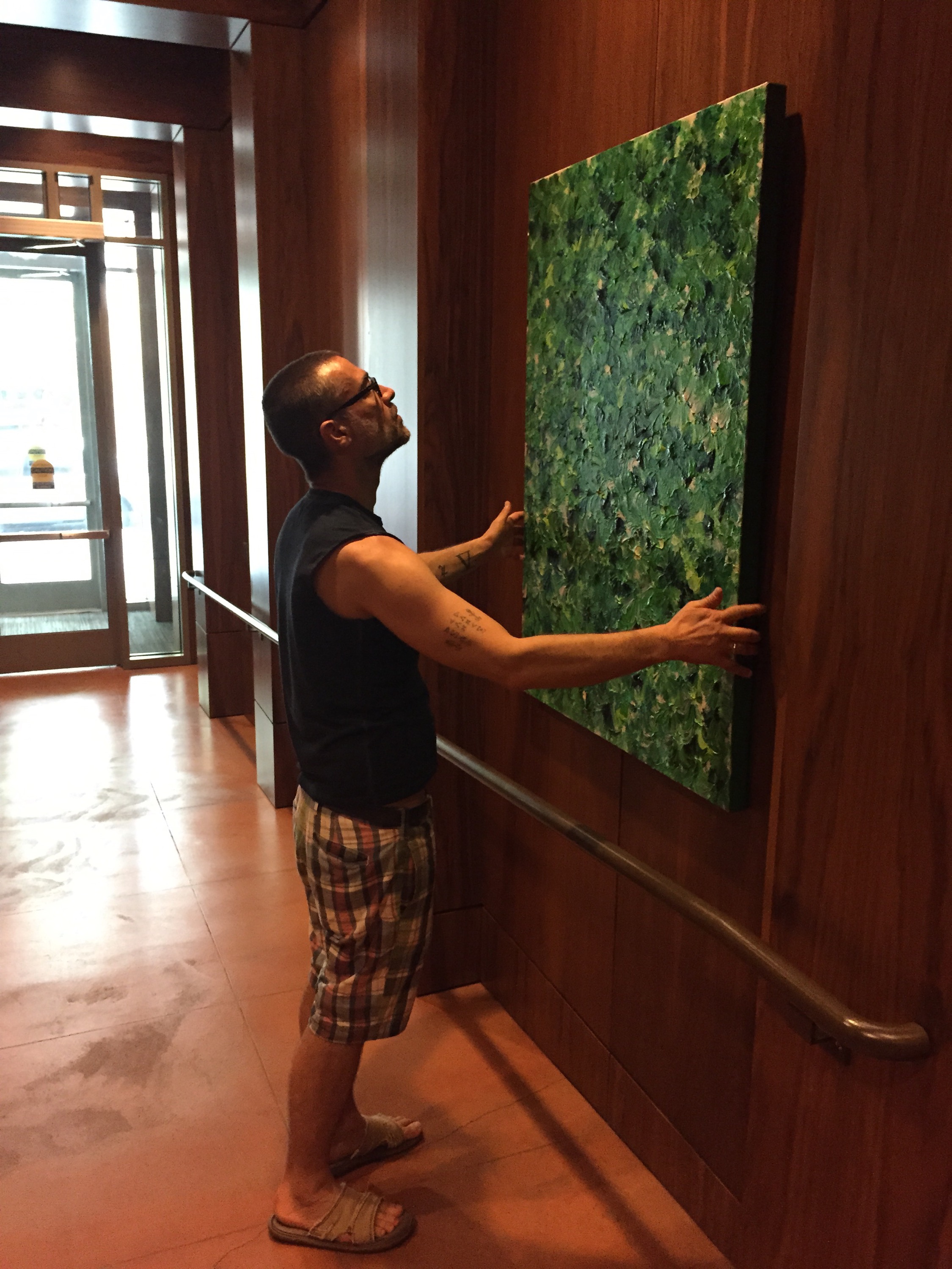 The install went perfect. The paintings are suspended from wires which made it the easiest hang ever! A big thank you to my Mom, Matt, and Kari for helping!!! Now I have a whole wall empty in my studio. Which is great, so I can start making more art. Three new flower paintings will be painted before month’s end!